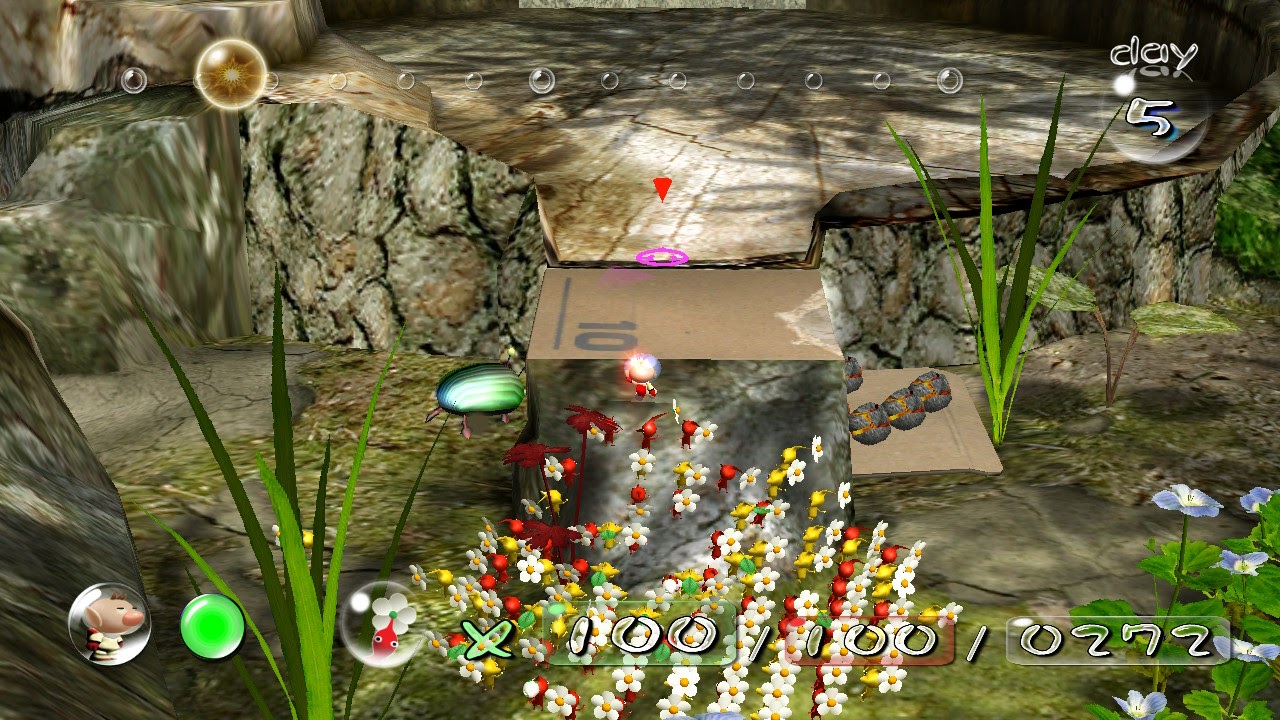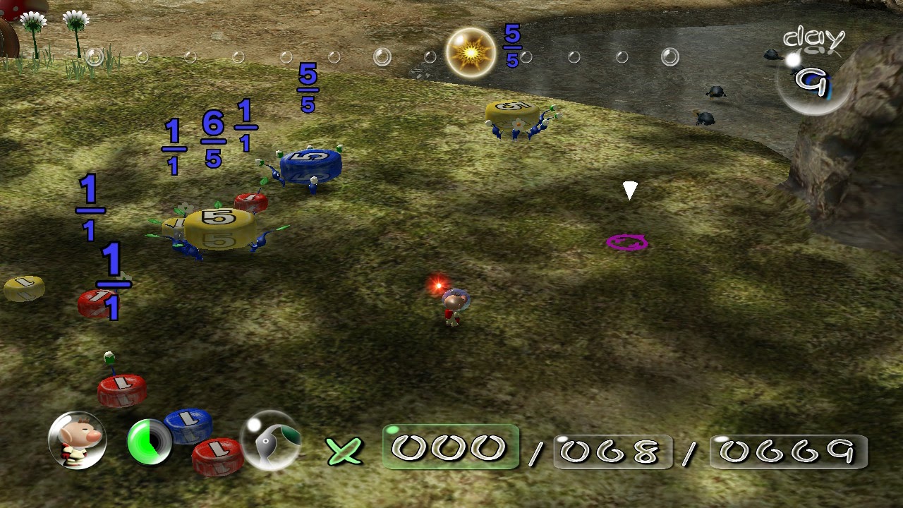 For those unfamiliar with the core concept of Pikmin, you must manage your day by exploring enclosed areas, collecting treasure and attempting to survive whilst under attack by the many aforementioned insect-like creatures on your journeys. You can take up to 100 Pikmin with you at any given time, however if they are eaten, crushed or drowned by the harsh environments surrounding them, they will perish and you will need to rebuild your army. This is done by harvesting the remains of the creatures you have defeated, and by collecting numbered tokens found around the planet. Items that you carry back to your base will have a number value, which determines how many Pikmin are required to carry it. With your in-game days limited, planning and efficiency is crucial in managing your exploration.