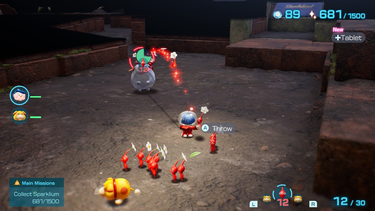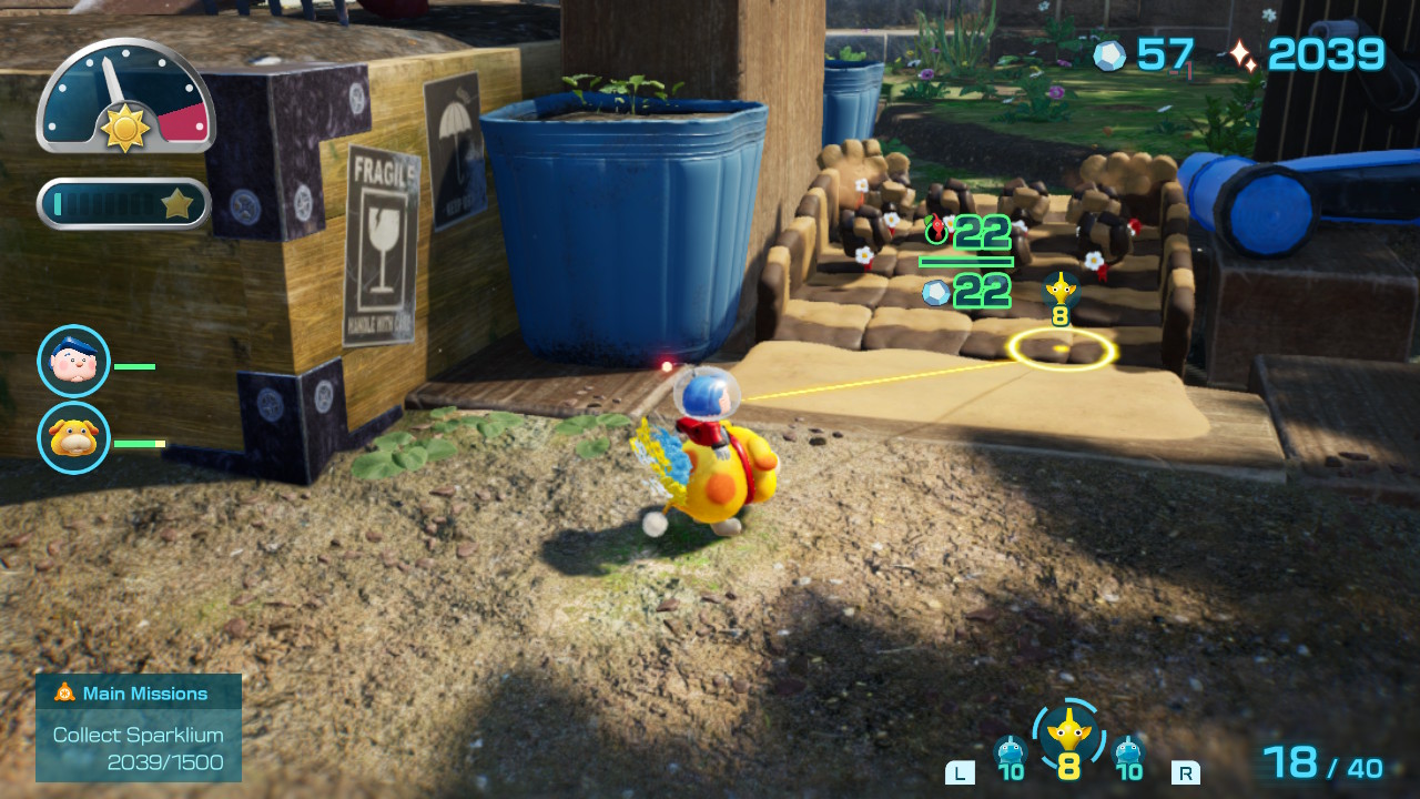 The opening hour or so of Pikmin 4 holds your hand to the point of frustration. It feels like there is an encylopedia’s worth reading to do while the game pauses every few moments to walk you through the basic tutorial step-by-step. Thankfully, once this is over, the world is your oyster and you can begin exploring and growing your humble army of Pikmin. To start with, you are introduced to a back-garden looking area which has a number of treasures, tunnels and of course insect-like creatures that will try and stop you in your path. The simple goal is to collect treasure, which contains a chemical which can be used as fuel, known as Sparklium. Collect enough Sparklium, you unlock a new area to explore, but that’s not all there is to Pikmin 4, although that is your main goal.