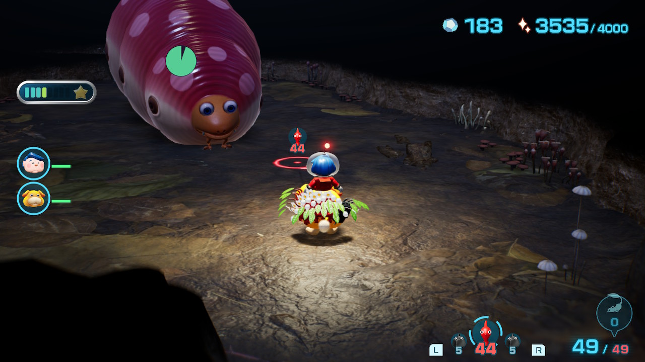 As a series first, you can explore the planet at night. You’re not exploring the planet as you would in a day, instead you’re defending a Lumiknoll – a luminous ant-hill-like structure in the ground, with the newly added Glow Pikmin. Within the span of the night, you must protect this structure at all costs, either by defeating every enemy on the map, or by simply holding them off from destroying the Lumiknoll by the time morning rolls around. The Glow Pikmin are special in that they are made by light and are the only kind who will dare venture in the dark, the time when all of the creatures become even more violent and rabid than they are in the daytime. You need to employ different tactics in this defensive mode, and it’s a great change of pace from the main game. Once you complete a mission, you are rewarded with medication for the aforementioned Leaflings that have been rescued, and you can cure them to return them to their human-looking identities.